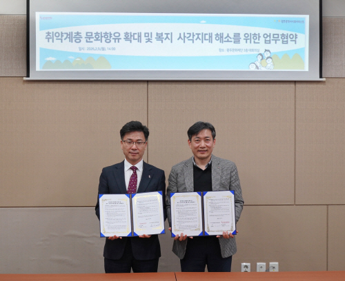 | 광주문화재단은 9일 광주시사회서비스원과 취약계층 문화향유 확대 및 복지 사각지대 해소를 위한 업무협약을 체결했다. |