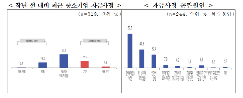 지난해 설과 비교해 자금 사정이 ‘곤란하다’고 응답한 중소기업은 29.8%로, ‘원활하다’는 응답(19.9%)보다 높게 나타났다. 절반 이상은 ‘보통’이라고 답했지만, 실제로는 자금 여력이 빠듯한 상태에서 명절 자금 수요를 버텨내고 있는 기업이 적지 않다는 의미로 해석된다.