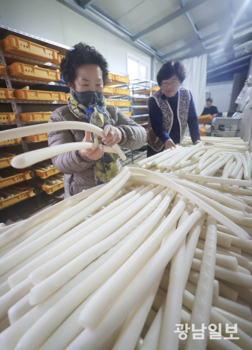 | 설 앞둔 떡집 풍경 설 연휴를 사흘 앞둔 11일 오후 나주 영산포 한 방아간에서 상인들이 떡국에 쓰이는 가래떡을 말리고 있다. 우리나라는 옛부터 설날에 떡국을 마련하여 조상께 차례를 지내고 새해 아침의 첫 식사로 떡국을 먹어 왔다. 그리고 설날에 기다란 가래떡을 썰어 떡국을 끓여 먹는 것은 장수를 기원하는 의미가 있다. 최기남 기자 bluesky@gwangnam.co.kr |