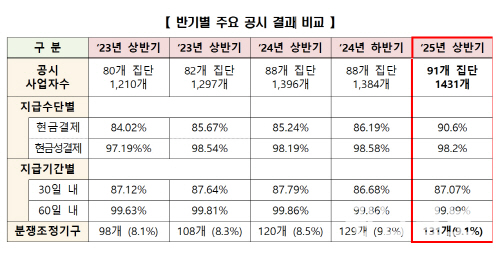 현금 결제(현금·수표, 만기 1일 이하 어음대체결제수단 등) 비율은 평균 90.6%로 2023년 공시 제도 도입 이래 가장 높았다. 현금결제비율은 2023년 84.02%를 기록한 이후 처음으로 90%를 돌파했다.