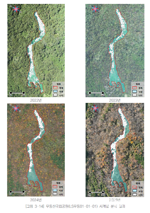 국립공원공단 관계자는 “나지 면적이 증가하는 일부 대상지는 추가 붕괴 가능성을 염두에 두고 지속적으로 점검하고 있다”며 “기존 모니터링 체계를 재정비해 기후변화에 대응할 수 있는 관리 기준을 마련하겠다”고 밝혔다.