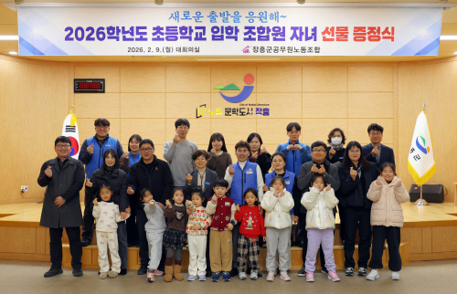 | 장흥군과 장흥군공무원노동조합은 최근 2026학년도 초등학교 입학을 앞둔 조합원 자녀와 가정을 격려하는 행사를 열고 학용품 세트를 전달했다. |
