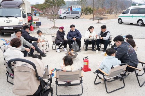 | 가족 단위 관광객들이 캠핑형 쉼터에 모닥불을 중심으로 모여 앉아 축제를 즐기고 있다. |