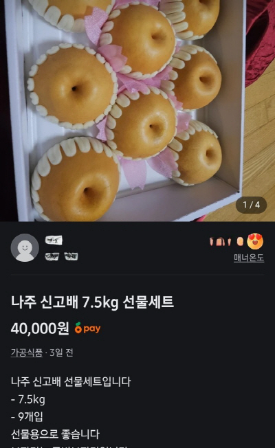 | 중고거래 플랫폼을 확인한 결과 ‘선물용’을 내세운 나주배 설 선물세트 판매 게시글이 올라왔다. |