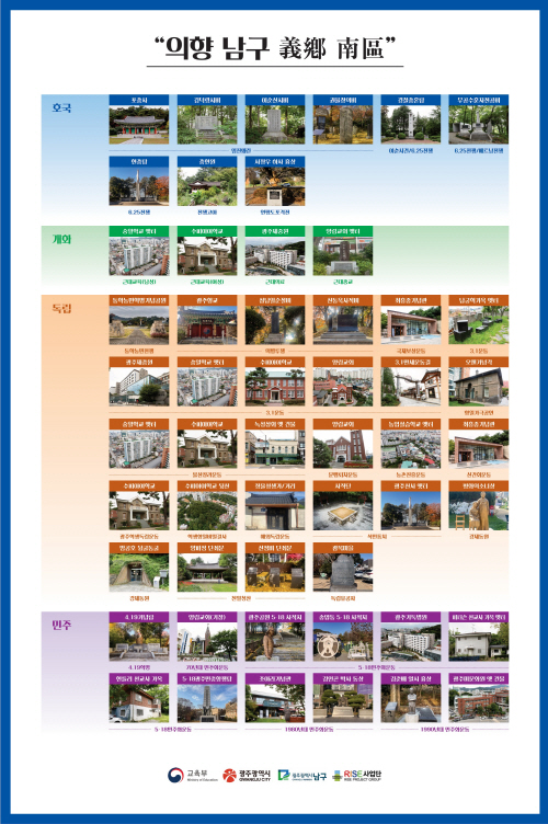 이번 전시회는 RISE사업 지·산·학·연 동아리 지원 프로그램 하나로 기획됐으며, 교수와 학생들이 사진영상학과와 협업해 조사·선정한 남구의 ‘호국’·‘개화’·‘독립’·‘민주’ 관련 역사문화자원을 52개의 판넬로 제작해 선보인다.