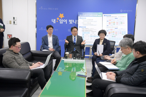 | 강기정 광주시장이 24일 시청 기자실에서 기자들을 만나 도시철도 2호선 개통에 대비한 역대 최대규모 신규 인력 채용계획을 설명하고 있다. 사진제공=광주시 |