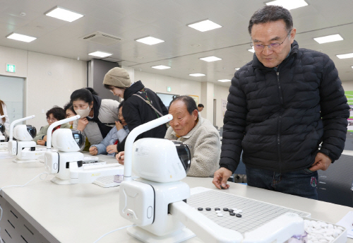 | AI 로봇과 오목 대결을 하고 있는 어르신들. |