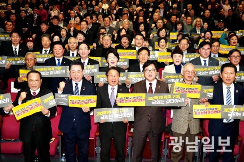 광주시와 전남도, 전국 시민사회단체, 5·18단체 등이 참여한 ‘5·18정신헌법전문수록개헌국민추진위원회’(이하 추진위)는 25일 국회의원회관 대회의실에서 ‘5·18정신 헌법전문 수록 개헌 촉구 국민결의대회’를 개최했다.