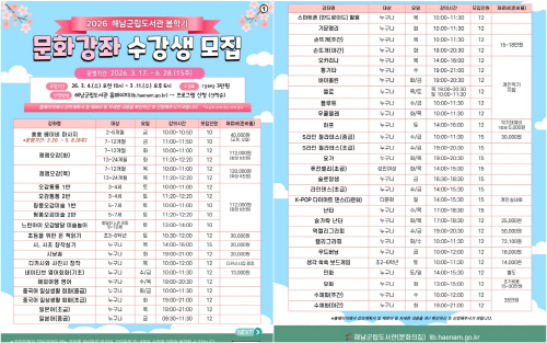 해남군 관계자는 “3월부터 시작하는 봄학기 문화강좌에 많은 군민들이 배움의 기쁨을 누리고 일상에서도 따뜻한 활력을 얻으시길 바란다”고 말했다.