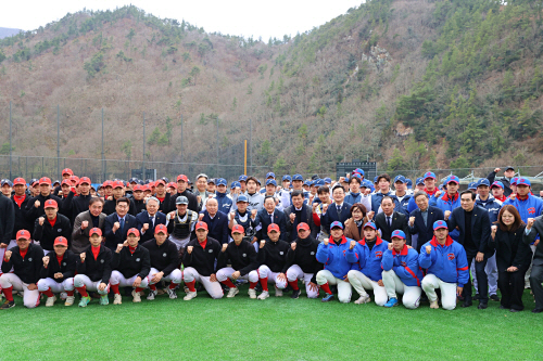 | 명현관 해남군수 등 관계자들은 해남스포츠파크 준공식에서 동계훈련을 위해 해남스포츠파크를 찾은 야구윈터리그 선수단과 기념촬영을 했다. 사진제공=해남군 |