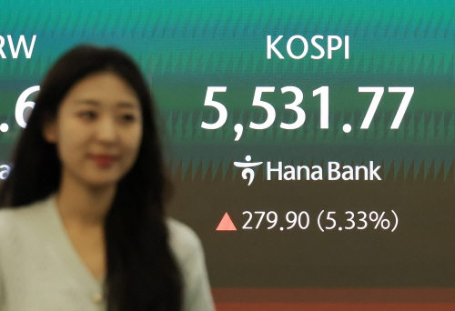 이날 코스피는 전장보다 271.34p(5.17%) 오른 5523.21로 출발해 280.72p(5.35%) 오른 5532.59로 장을 마쳤다.