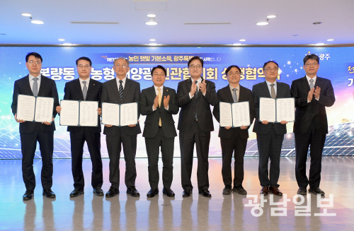 광주시는 11일 시청 중회의실에서 ‘본량동 영농형 태양광 민관협의회 상생협약식’을 열고 사업 추진을 위한 협력체계를 구축했다. 이날 협약식에는 강기정 광주시장과 우원식 국회의장, 농민 대표 등 150여명이 참석했다.