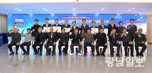 | 강기정 광주시장이 11일 시청 중회의실에서 열린 ‘본량동 영농형 태양광 민관협의회 상생협약식’에 참석해 우원식 국회의장을 비롯한 참석자들과 기념촬영을 하고 있다. |