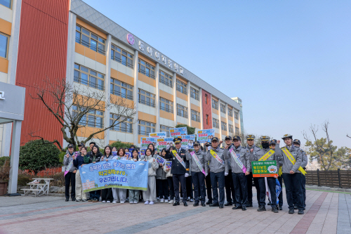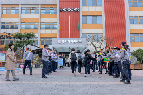 이날 김종득 남부경찰서장을 비롯해 학교전담경찰관(SPO), 동아여중 교직원, 학생 등 총 30여명이 참여해 등굣길 학생을 대상으로 홍보 물품을 전달하고 학교폭력 예방의 중요성을 알렸다.