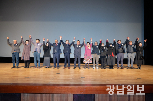 | 광주미술협회는 지난 13일 오후 2시 빛고을시민문화관 공연장에서 제12·13대 지회장 이·취임식을 거행했다. 사진은 새로운 도약을 다짐하고 있는 광주미술협회 집행부. |