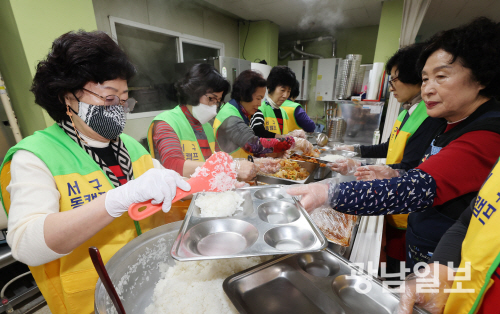 | 18일 오전 광주 서구 양동 광남장로교회에서 열린 빨간밥차 무료급식 나눔 행사에서 자원봉사자들이 어르신들에게 배식 봉사를 하고 있다. 최기남 기자 bluesky@gwangnam.co.kr |