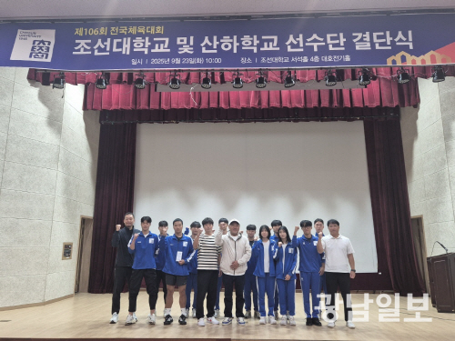 | 김민주 광주시육상연맹회장과 제106회 전국체전에 출전하는 조선대학교 육상팀이 기념 촬영하고 있다. |