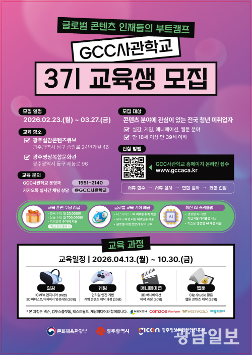 모집 대상은 만 18세~39세 이하 콘텐츠 분야에 관심 있는 전국 청년 미취업자 100명 내외로, 오는27일까지 GCC사관학교 공식 누리집을 통해 신청할 수 있다. 서류심사와 면접 심사 등 단계별 절차를 거쳐 4월 3일 최종 합격자를 발표할 예정이다.