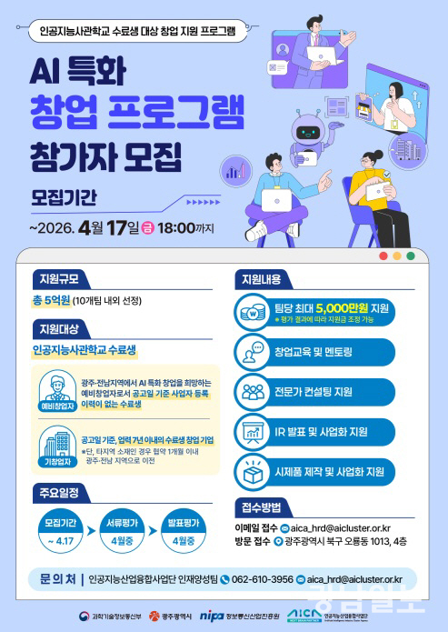 AICA은 과학기술정보통신부, 광주시, 정보통신산업진흥원의 지원을 받아 ‘2026년 AI 특화 창업프로그램’을 추진하고, 오는 4월 17일까지 참가자를 모집한다고 23일 밝혔다.