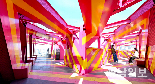 23일 오후 광주 동구 서석동 광주영상복합문화관 옥상에 설치된 ‘뷰폴리(View Folly)’를 찾은 시민들이 휴식을 취하고 있다. ‘뷰폴리’는 광주폴리Ⅲ의 대표 작품으로 건축가 문훈과 리얼리티즈 유나이티드, 팀 에들러 & 얀 에들러가 협업해 제작한 도심 속 전망과 휴식 기능을 결합한 전망대형 건축물로 시민들에게 일상 공간에서 새로운 시각적 경험을 제공하는 도시 재생형 공공건축물이다.그동안 ‘뷰폴리’는 안전한 운영을 위한 인력배치가 어려워 시민 출입이 제한됐으나 광주 동구가 4개월간 운영 인력을 지원하기로 하면서 한시적 개방 운영한다.개방 시간은 월요일부터 금요일까지, 오후 2시부터 오후 6시까지다.