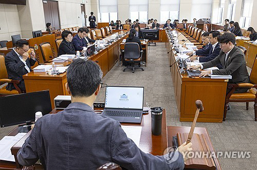 | 24일 국회에서 열린 국회 행정안전위원회 법안심사제1소위원회에서 위원장인 더불어민주당 윤건영 의원이 개회를 선언하고 있다. 연합뉴스 |