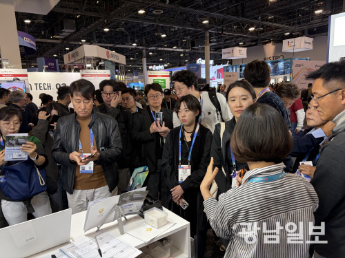 | 세계 최대 IT·가전 전시회 CES에 마련된 엘비에스테크 부스를 찾은 관람객들이 직원의 설명을 듣고 있다. |