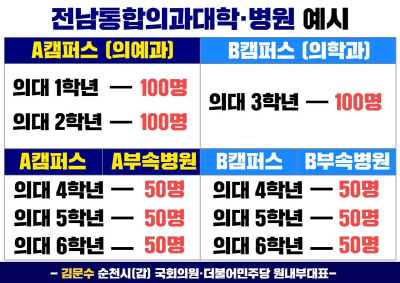 더불어민주당 김문수 의원(순천·광양·곡성·구례 갑)은 2일 “전남국립의대 부속병원을 서부권과 동부권 2곳에 각각 설립해, 의대 4·5·6학년생들이 전공 학부에 따라 실습 공부를 할 수 있게 하는 방안이 바람직하다”며 “이를 교육부와 협의하고 두 대학과 긴밀히 논의하겠다”고 밝혔다.