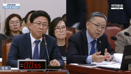 | 지난해 10월 14일 열린 교육부 국정감사에서 질의하는 더불어민주당 김문수 의원(순천·광양·곡성·구례 갑, 오른쪽)과 최교진 교육부 장관. [국회방송 캡처 = 김문수 의원실] |