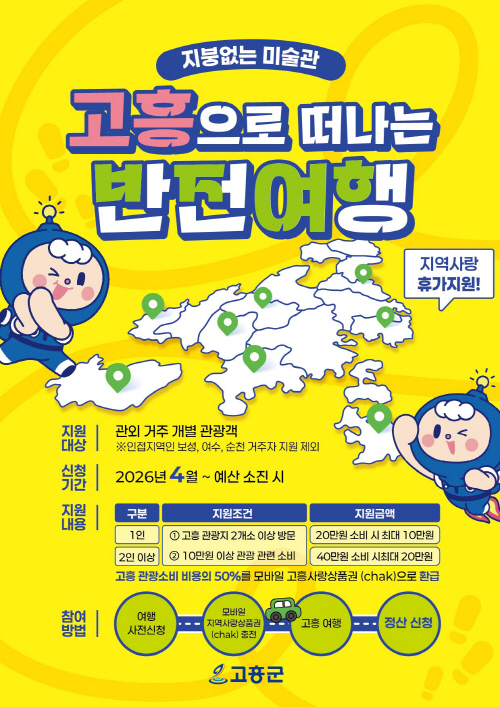 공영민 고흥군수는 “고흥이 가진 다채로운 매력을 발견하고, 실질적인 여행비 환급 혜택도 누리시길 바란다”며 “관광객과 소상공인 모두에게 기분 좋은 반전이 되는 사업이 되도록 운영에 최선을 다하겠다”고 말했다.