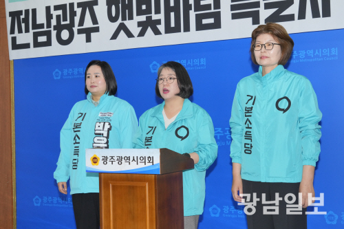 | 용혜인 기본소득당 대표가 박은영·문지영 전남광주특별시의원 후보와 함께 6일 광주시의회 브리핑룸에서 기자회견을 갖고 재생에너지 에너지 전환 비전을 제시하고 있다. |
