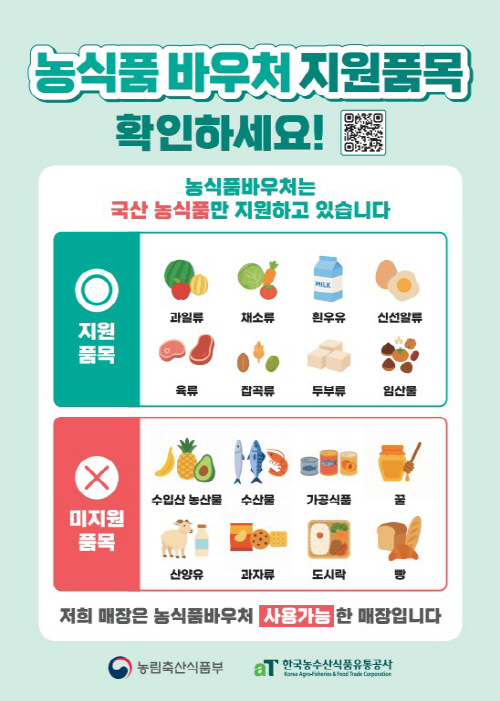 대상자는 바우처 카드를 통해 국내산 과일과 채소, 흰우유, 알류, 육류, 잡곡류, 두부류 등 신선 농식품을 구매할 수 있다. 사용처는 로컬푸드 직매장, 농협하나로마트 등 지정된 매장이다.
