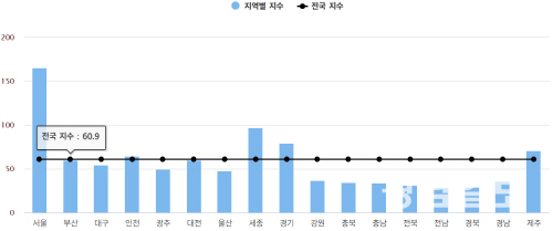 세종이 97.3으로 두 번째였고, 경기(79.4), 제주(70.5), 인천(65.0) 등이 전국 지수를 웃돌았다.