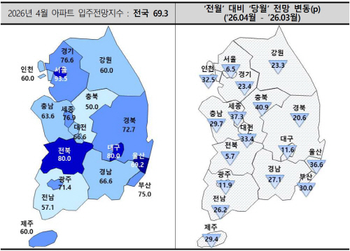 전국 입주전망지수가 70 미만으로 하락한 것은 탄핵정국으로 불확실성이 확대됐던 2025년 1월 이후 15개월 만이다.