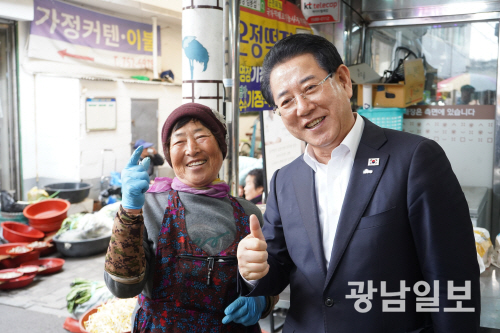 | 김영록 더불어민주당 전남광주통합시장 예비후보가 최근 순천 웃장을 찾아 상인들을 대면 접촉하며 민심을 청취하고 있다. |