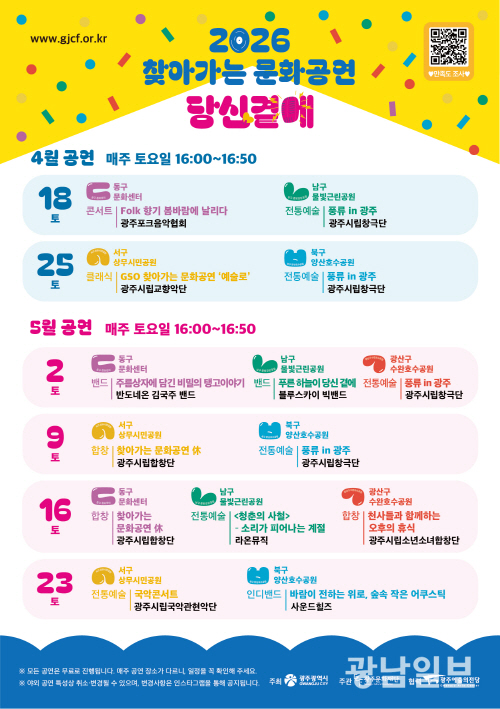 황인채 광주시 문화체육실장은 “찾아가는 문화공연을 통해 시민들이 일상에서 문화예술을 보다 쉽게 접하길 바란다”며 “올해는 지역 예술인 참여를 확대하고 프로그램 다양성을 강화한 만큼 체감도 높은 문화 향유 기회를 제공하겠다”고 말했다.