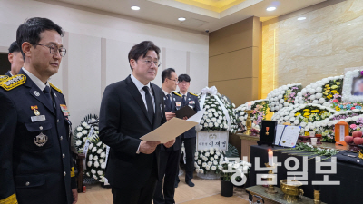 13일 소방청에 따르면 이 대통령은 13일 완도군 소재 장례식장에 마련된 빈소에 조전을 보내 고 박승원 소방경(44)과 고 노태영(30) 소방교의 희생을 기렸다. 조전은 홍익표 청와대 정무수석이 현장에서 직접 낭독했다.