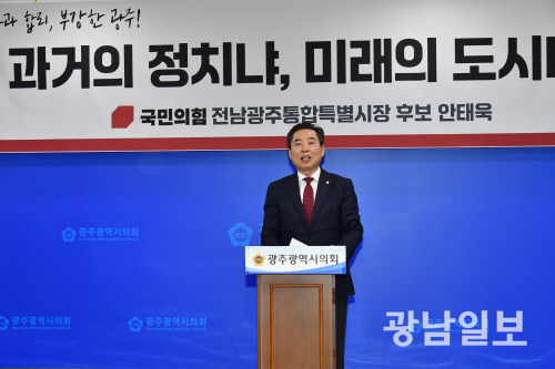 | 국민의힘 안태욱 광주시당위원장이 13일 광주시의회 브리핑룸에서 기자회견을 갖고 전남광주통합특별시장 출마를 선언하고 있다. |