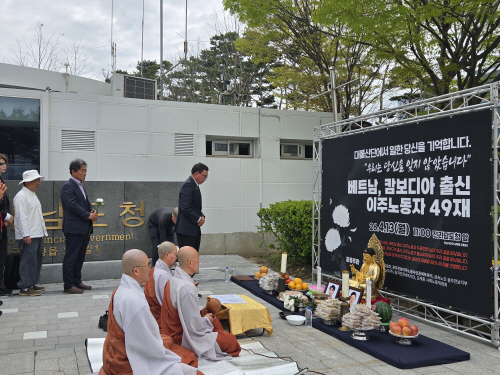 영암 대불산단에서 일하다 사망한 베트남, 캄보디아 출신 이주노동자 2명을 추모하는 49재가 전남도청 앞에서 엄수됐다.