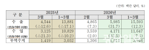15일 광주본부세관이 발표한 ‘3월 광주·전남지역 수출입 현황’ 자료에 따르면 수출은 전년 동월 대비 31.7% 증가한 59억8500만 달러, 수입은 33.5% 증가한 41억7100만 달러로 무역수지는 18억1400만 달러 흑자를 기록했다.