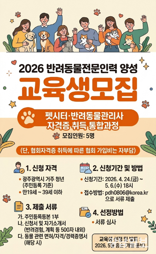배귀숙 광주시 농업동물정책과장은 “반려동물 산업이 빠르게 성장하면서 신뢰할 수 있는 전문 인력에 대한 수요가 어느 때보다 높아지고 있다”며 “이번 교육을 통해 양성된 인재들이 지역에 정착해 성숙한 반려문화를 이끄는 핵심 인력으로 성장하길 기대한다”고 말했다.