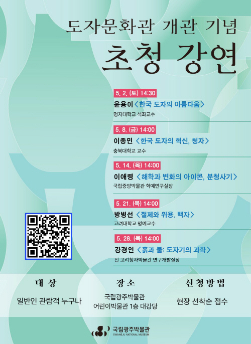 국립광주박물관(관장 최흥선)은 5월2일부터 28일까지 오후 2시 어린이박물관 2층 대강당에서 도자문화관 개관 기념 전문가 초청 강연을 진행한다.