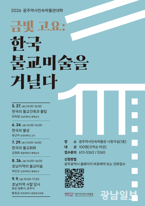 이부호 광주역사민속박물관장은 “광주역사민속박물관대학은 전통문화의 가치와 의미를 우리의 삶 속에서 새롭게 조명하는 데 목적이 있다”며 “31번째로 열리는 이번 강좌를 통해 시민들이 한국 불교미술의 흐름을 입체적으로 이해하고, 문화유산을 보다 깊이 있게 향유하는 계기가 되길 바란다”고 말했다.