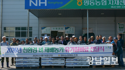 | 광주 평동농협은 최근 본점 자재센터 앞에서 ‘2026년 친환경 벼 재배농가 유기질 비료 전달식’을 가졌다. |