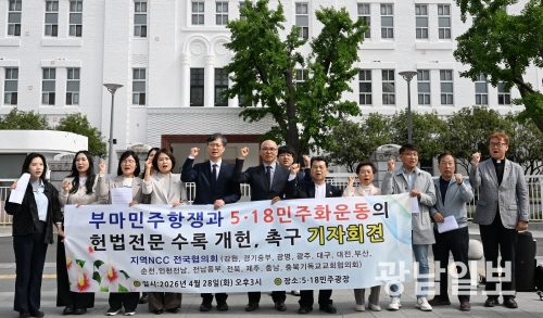 28일 오후 광주 동구 5·18민주광장에서 열린 기자회견에서 광주NCC(한국기독교교회협의회) 회원들이 부마민주항쟁과 5·18민주화운동의 헌법전문 수록 개헌을 촉구하며 구호를 외치고 있다.