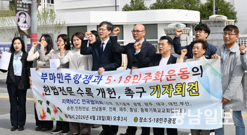| 5·18민주화운동 헌법전문 수록 개헌 촉구 28일 오후 광주 동구 5·18민주광장에서 열린 기자회견에서 광주NCC(한국기독교교회협의회) 회원들이 부마민주항쟁과 5·18민주화운동의 헌법전문 수록 개헌을 촉구하며 구호를 외치고 있다. 최기남 기자 bluesky@gwangnam.co.kr |