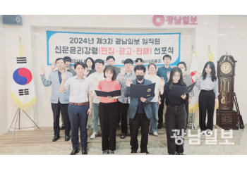 송하종 기자 hajong2@gwangnam.co.kr2024.06.11 18:48광남일보(대표이사·회장 전용준)는 지난 28일 정론직필로 광주·전남 지역민들의 알 권리를 충족시키며 언론 개혁을 선도하기 위한 ‘신문윤리강령 선포식’을 개최했다. 이날 오전 본사 사옥 1층 MVG라운지에서 열린 ‘...