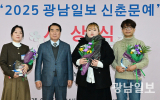 고선주 기자 rainidea@gwangnam.co.kr2025.01.16 18:42‘2025 광남일보 신춘문예’ 당선자들은 앞으로 꾸준히 문학의 길을 걸으며 정진해나가겠다는 포부를 드러냈다. 시 당선자 이지우씨는 올해 첫번째 신춘문예 투고로 당선의 기쁨을 안았다. 그는 “당선 전화를 받았을 ...