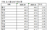 송대웅 기자 sdw0918@gwangnam.co.kr2025.12.09 17:36광주지역 아파트분양전망지수가 3년 만에 최저치를 기록했다. 10·15 대책 이후 지방 부동산 거래량이 소폭 증가했지만, 광주는 미분양이 누적되고 수요 회복 속도가 더딘 지역적 특성이 맞물리면서 분양시장 심리가 빠르...