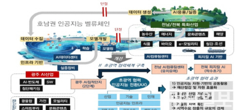 자치"호남권 초광역 AX 혁신벨트 구축 시급"호남권의 인공지능 밸류체인 완성을 위해 초광역 AX(인공지능 전환) 혁신벨트를 구축하고, 지역 내 단일 AI 산업 생태계를 조성해야 한다는 주장이 나왔다. 광주연구원은 24일 ‘광주정책포커스’ 제22호 ‘호남권 초광역 AX혁신벨트 구축 방안’ 보고서를 통해 이 같은 구상을 밝혔다. 보고서는 정부의 ‘5극 3특(5대 초광역 경제권·3대 특별자치시·도)’ 정책이 지역 주도의 자립형 혁신 체계 구축을 핵심으로 하는 만큼, 호남권(광주·전남·전북)이 선제적으로 첨단산업 중심의 통합 경제권 전략을 마련해야 한다고 강조했다. 특히 국가AI전략위원회가 수립한 ‘인...
