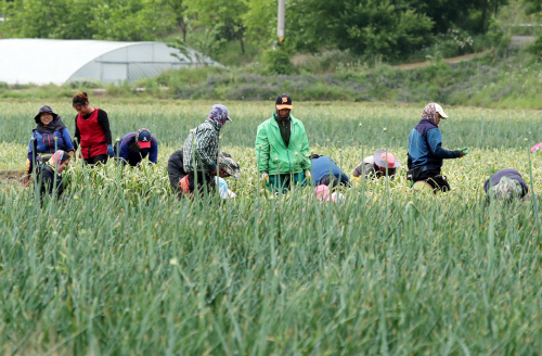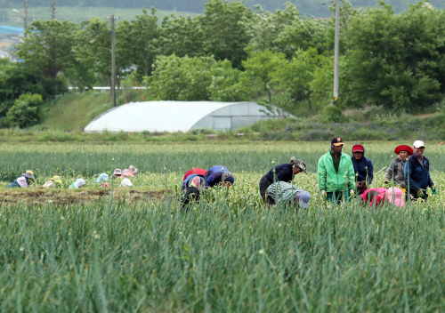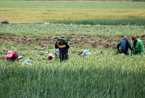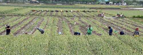 지난 주말 평균 94mm의 단비가 그치고 강한 바람에 다소 쌀쌀한 날씨를 보인 20일 마늘 주산지로 알려진 전남 강진군 작천면 들판에서 마늘수확을 하는 농부들의 손놀림이 분주하다.